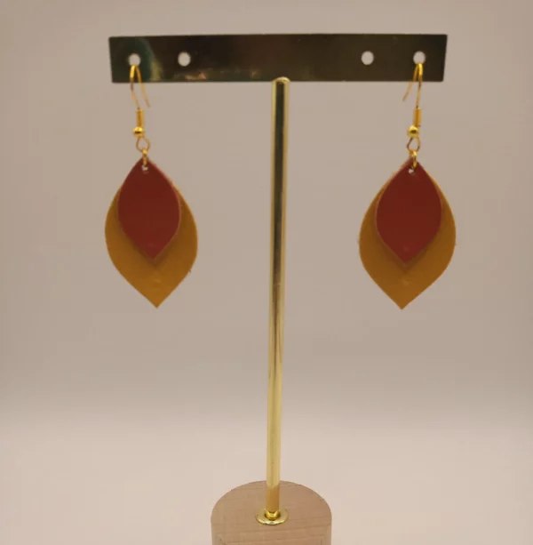 Boucle en acier inoxydable doré, conçue en forme de feuille, avec un design élégant et raffiné. Le cuir jaune et marron apporte une touche de chaleur et de contraste.