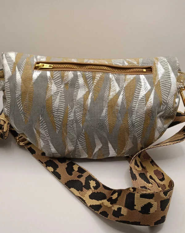 Sac banane artisanal en simili doré avec un tissu mélangeant doré et argenté, et une doublure marron recyclé. Il est équipé d’une sangle réglable à motif panthère pour un look audacieux et unique.
