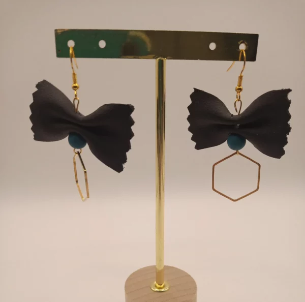 Boucles d’oreilles en acier inoxydable doré, faites main. Un nœud en cuir noir orné d’une perle bleu nuit et d’une pampille géométrique, pour un design moderne et sophistiqué.