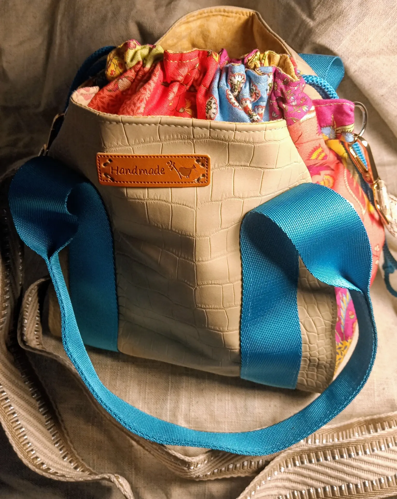 Sac en forme de seau en tissu et simili cuir crème, avec deux poches extérieures et une doublure recyclée. Fermeture à cordon, sangle réglable pour porter à l’épaule et anses pour porter au bras. Patchwork coloré pour une touche moderne et unique.