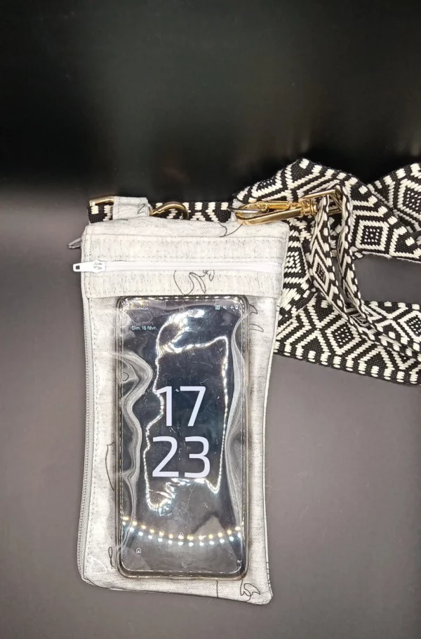 Cette pochette innovante combine protection et praticité. Elle dispose d’une partie transparente et tactile, permettant d’utiliser votre téléphone tout en le protégeant contre les rayures et les éclaboussures. En plus de cette fonction, une seconde poche avec fermeture éclair est prévue pour glisser une carte bancaire ou un porte-monnaie, offrant ainsi un moyen pratique de transporter vos essentiels. Le tout est fabriqué dans un tissu original avec un motif visage, ajoutant une touche stylée à l’ensemble. Sa sangle réglable permet de l’adapter à votre confort, vous offrant ainsi une solution tout-en-un pour transporter votre téléphone et vos petits objets de manière sécurisée et élégante.